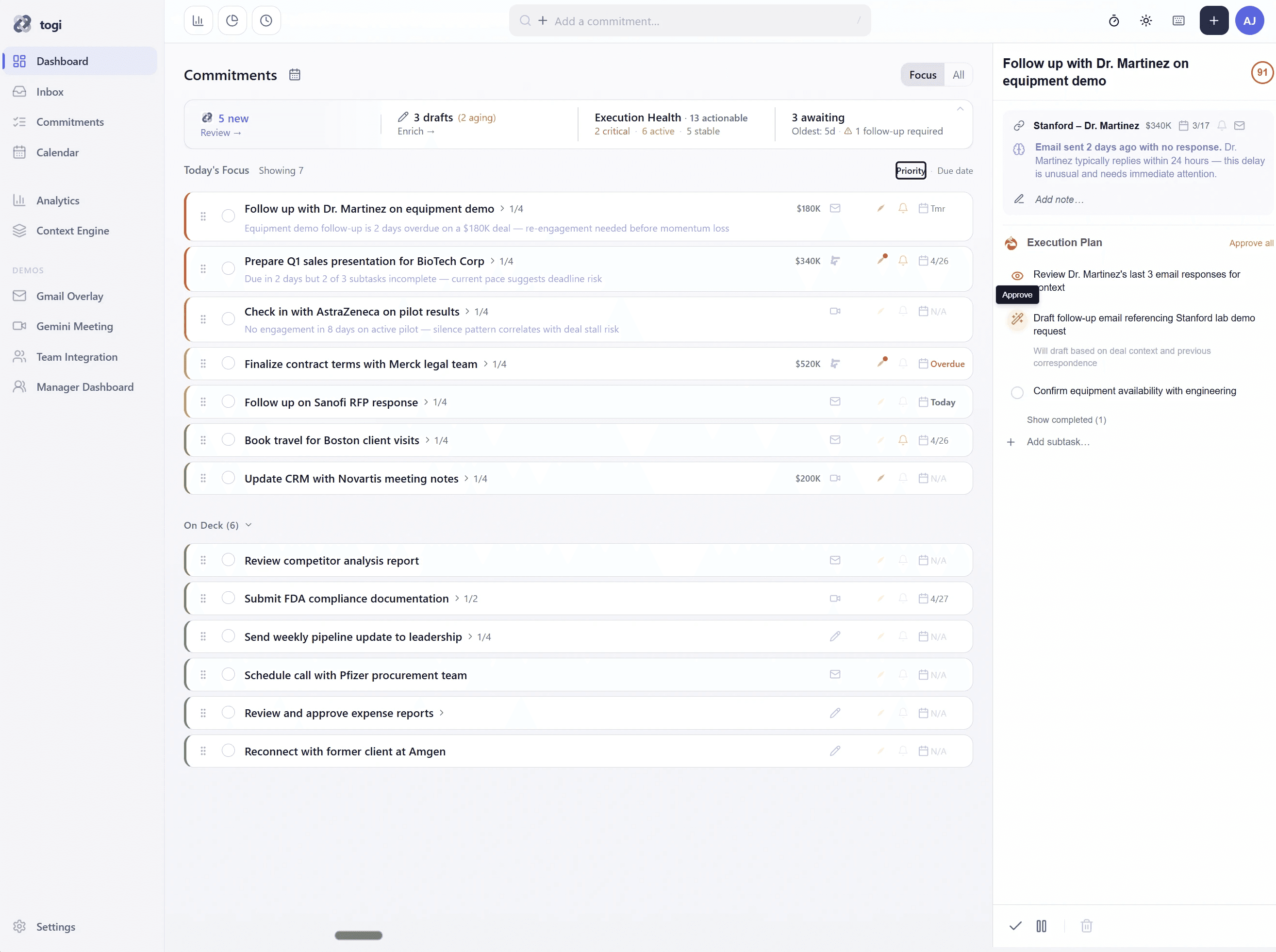 Togi detects your commitments across every tool, contextualizes and prioritizes them,